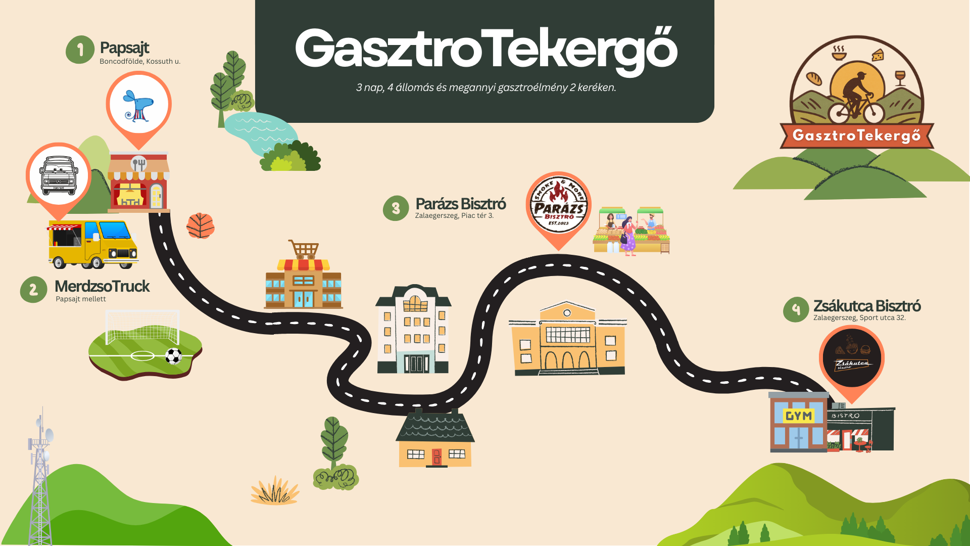 Négy megálló, négy felejthetetlen élmény! Minden helyszínen egyedi menüsorral készülnek, hogy igazán különleges legyen az utad. Csekkold a térképet, pattanj bringára, és kóstold végig Zalaegerszeg legjobb fogásait!